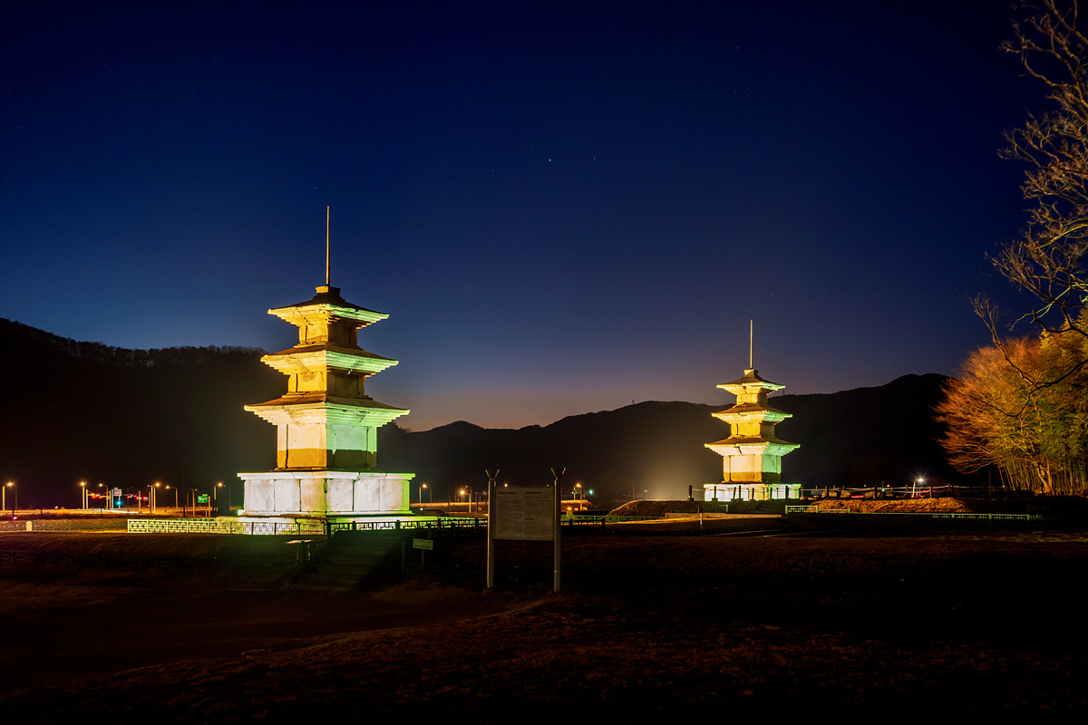 우뚝 솟은 두 삼층석탑은 만들어진 연대가 확실한 통일신라 초기의 석탑으로서 수십 개의 부분으로 나누어 만들어 조립식으로 세운 것으로 전체 높이 13.4m에 이르는 신라 삼층석탑 중 최대의 것입니다.
