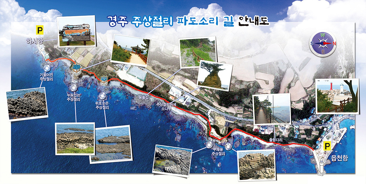 파도소리길은 읍천항에서 하서항까지를 잇는 1.7㎞ 해안길입니다. 이곳에는 2012년 9월 천연기념물 536호로 지정된 경주 양남 주상절리 군이 있습니다. 천연기념물로 지정된 구간은 해안을 따라 약 1.5㎞에 이릅니다.