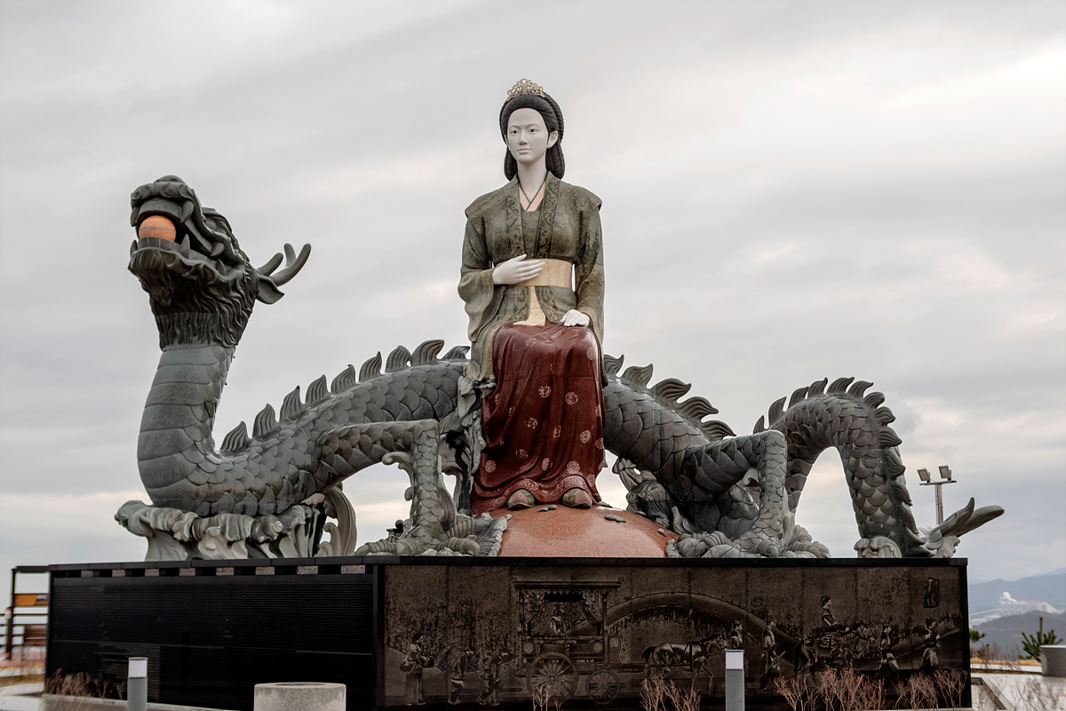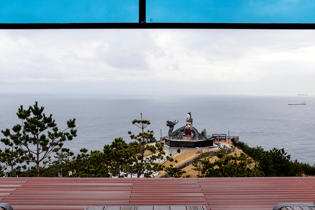공원에는 수로부인의 거대한 조각상이 동해를 등지고 여의주를 물고 있는 용과 함께 있습니다.
